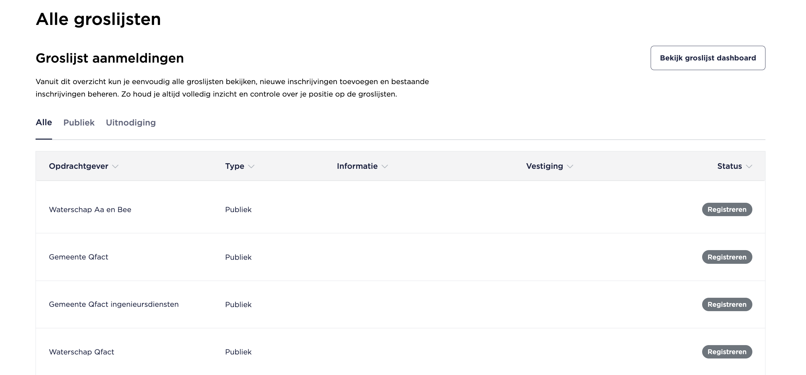 In Qfact kun je je aanmeldingen voor groslijsten bij opdrachtgevers beheren. Ook vind je hier interesseverzoeken voor projecten en de mogelijkheid om daarop te reageren.