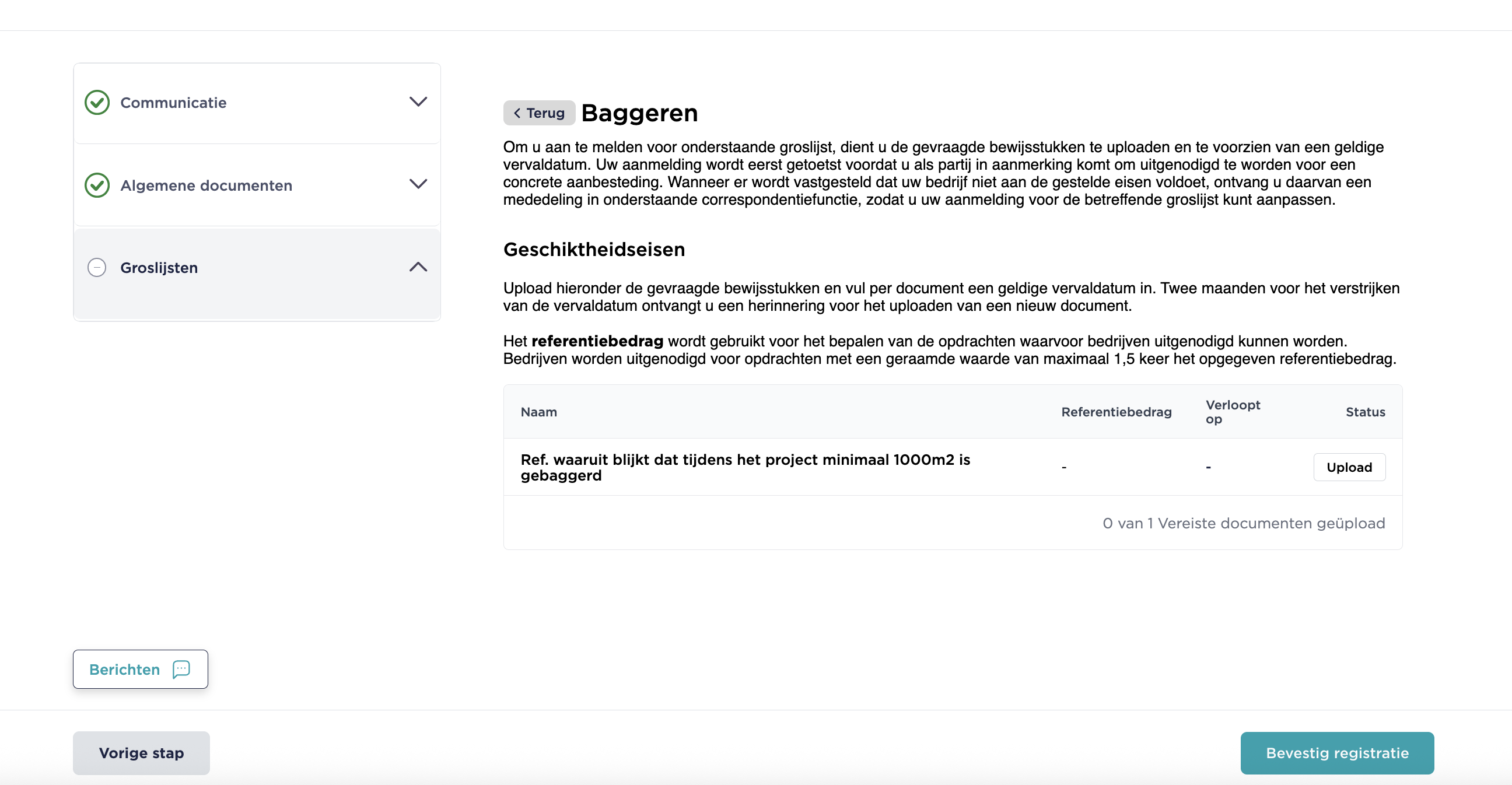 7. Voltooi de aanmelding. Upload hier de gevraagde documenten en vul, indien hier om gevraagd wordt, de vervaldatum en het referentiebedrag in. Klik op 'Bevestig registratie' om de aanmelding te voltooien. Je aanmelding krijgt nu de status 'In afwachting'. De opdrachtgever ontvangt een bericht van jouw aanmelding en zal deze gaan controleren. Je kunt je aanmelden voor meerdere groslijsten.