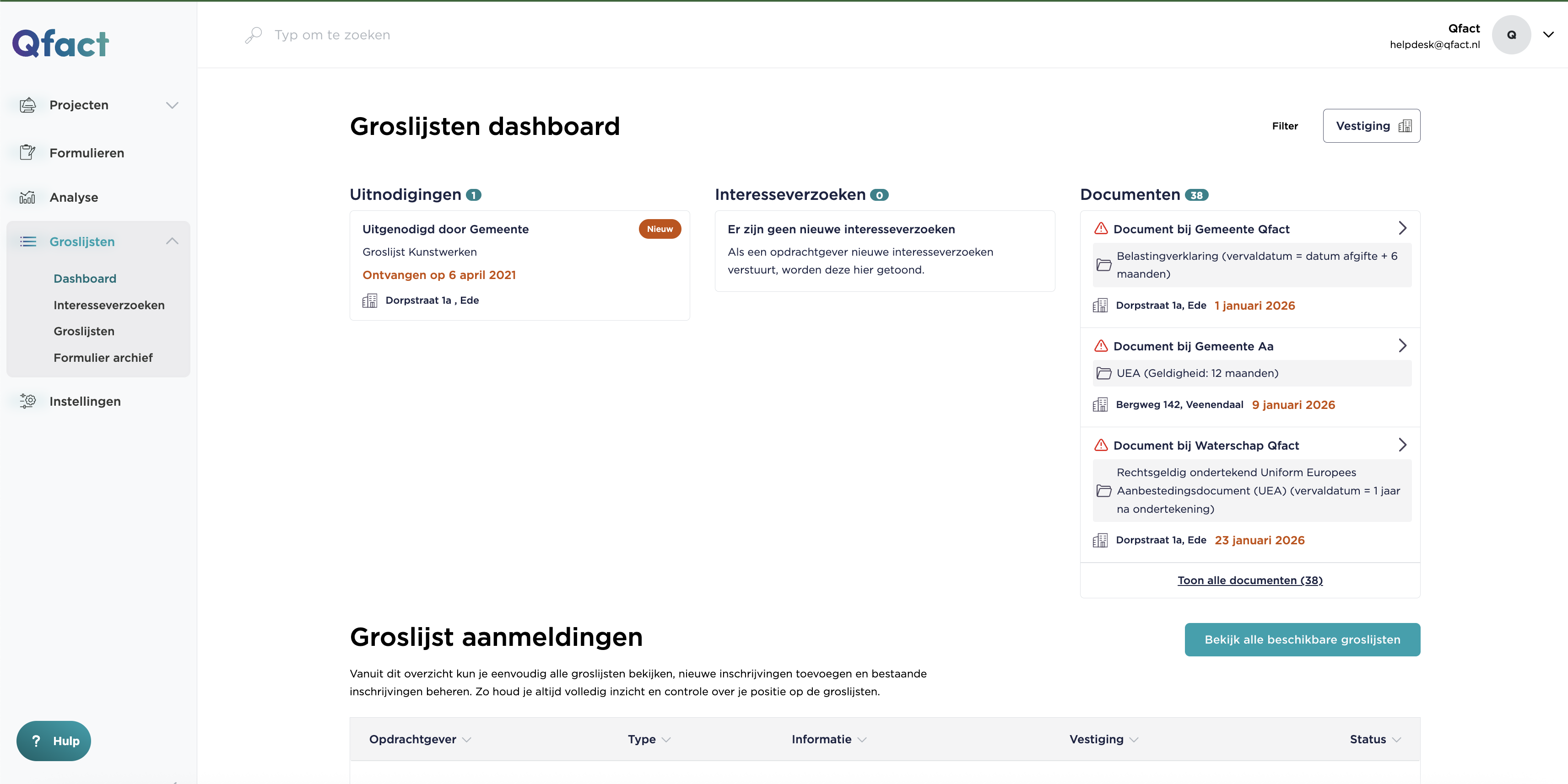 Het dashboard biedt een centraal overzicht van alle activiteiten die aandacht vragen. In dit artikel lees je hoe je de onderdelen Uitnodigen, Interesseverzoeken, Verlopen documenten en Groslijst aanmeldingen gebruikt om snel en efficiënt te werken binnen het platform.