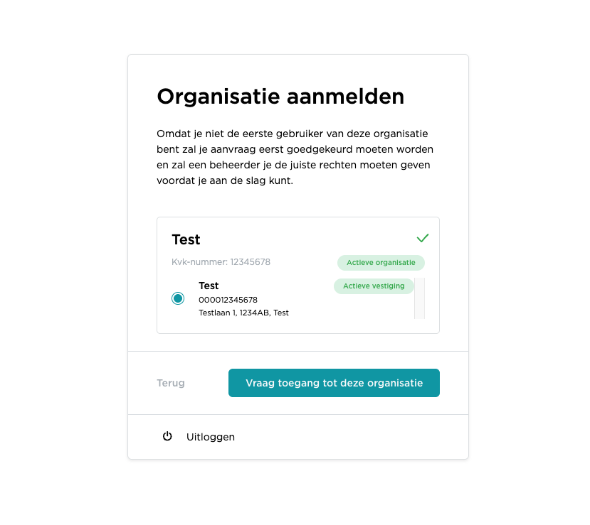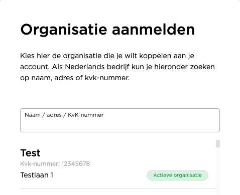 Na het kiezen van een bv (kvk) kun je zien welke vestigingen bekend zijn en je je kunt aanmelden. Selecteer deze vestiging.